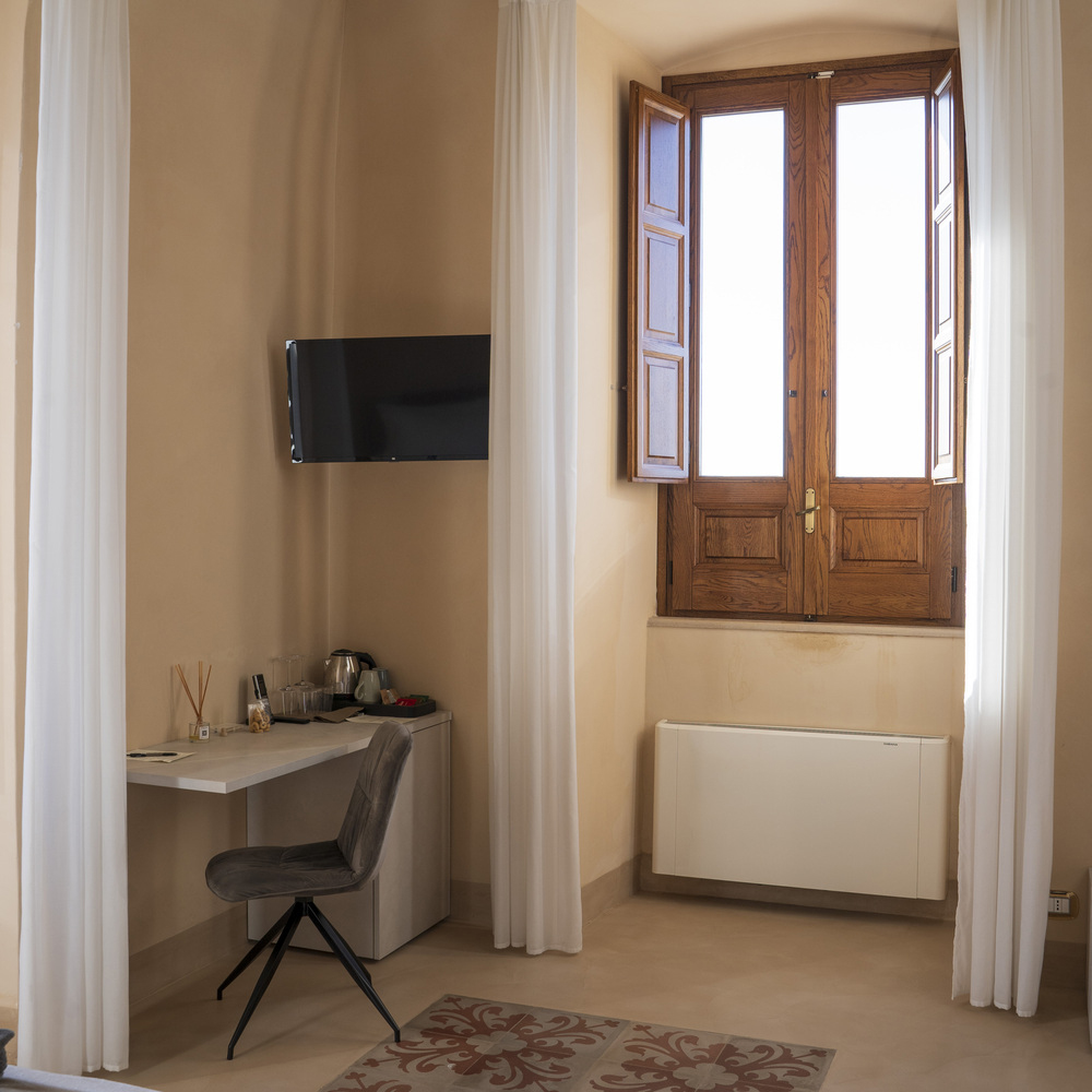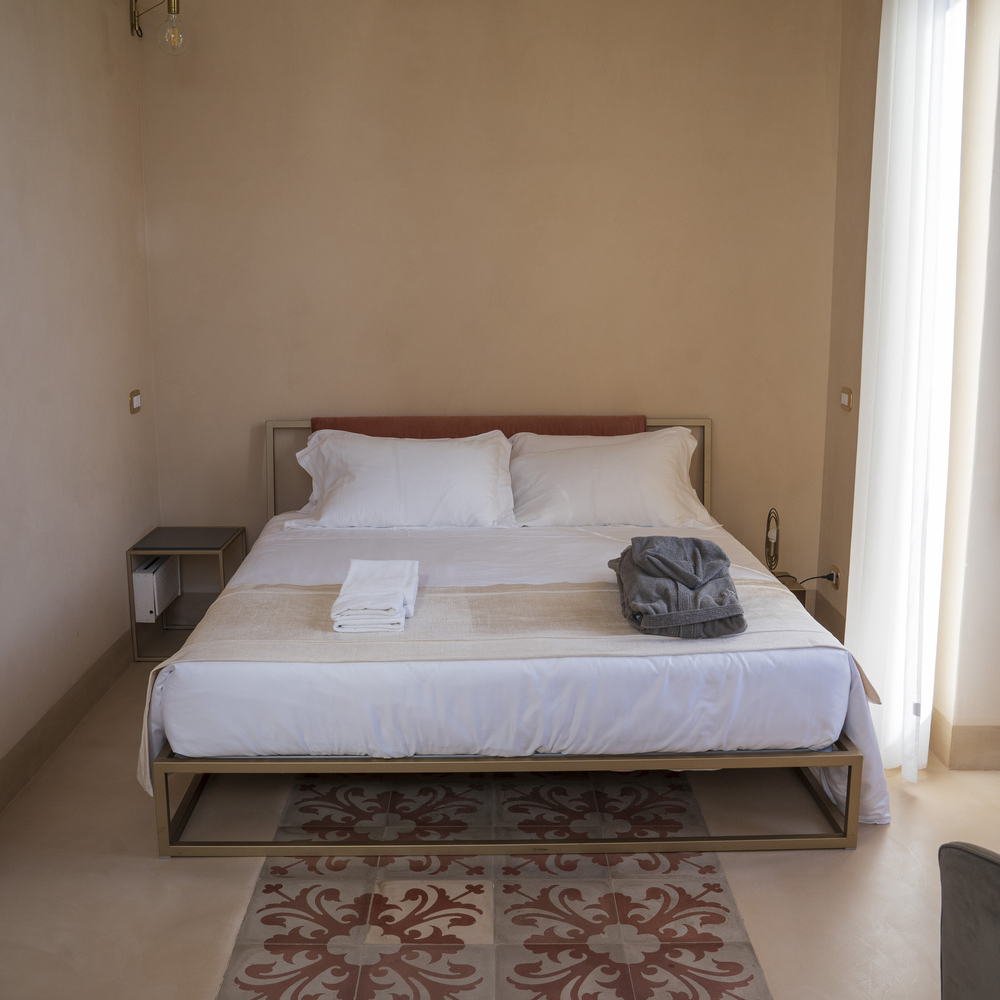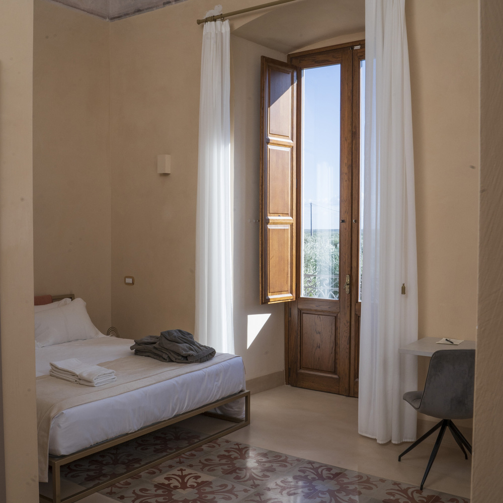 La camera da letto di don Giuseppe Pesce, il signore della Villa. Si affaccia sul fronte e sul giardino, permettendo all’antico proprietario di controllare l’intera tenuta, che duecento anni fa si estendeva ben oltre la attuale strada statale.