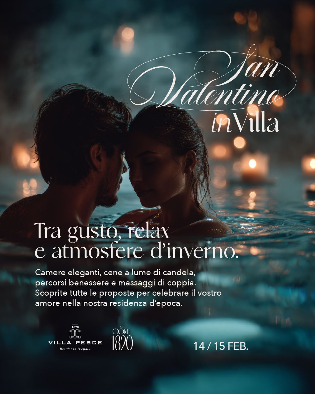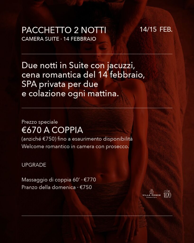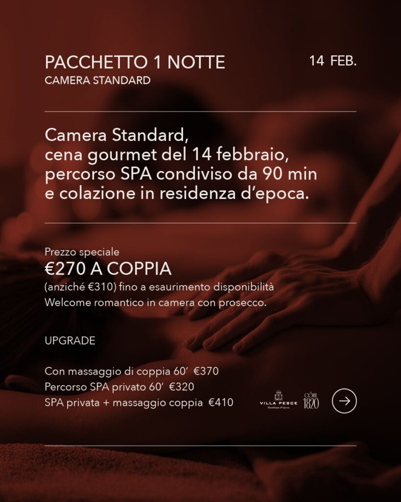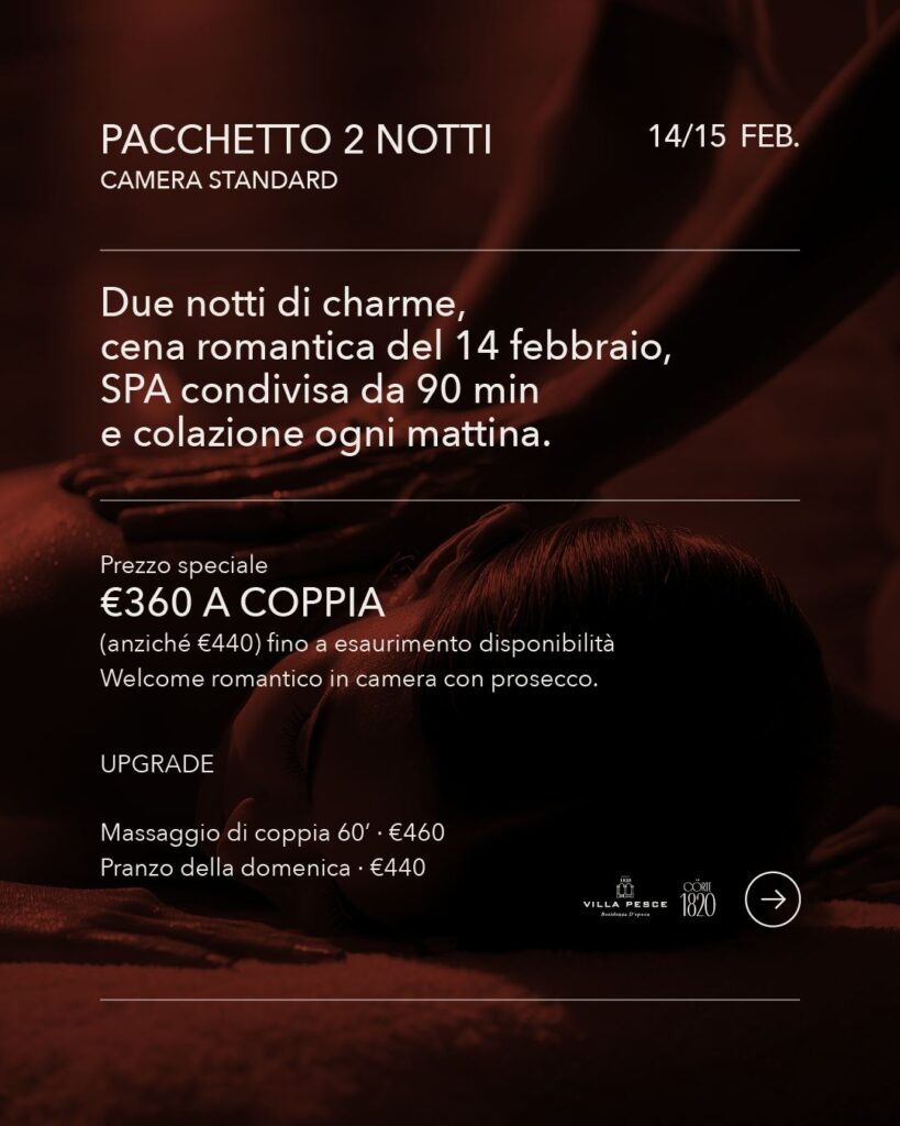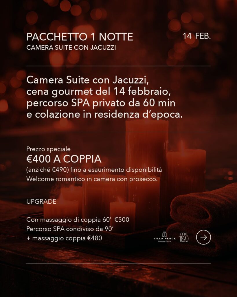Il Pacchetto San Valentino in Villa è pensato per chi vuole concedersi una fuga romantica lontano dalla routine, immerso in un’atmosfera calda e avvolgente, tra luci soffuse, profumi d’inverno e momenti da ricordare.
